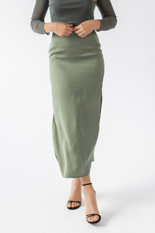 Dayton Olive Satin Midi Skirt - FINAL SALE